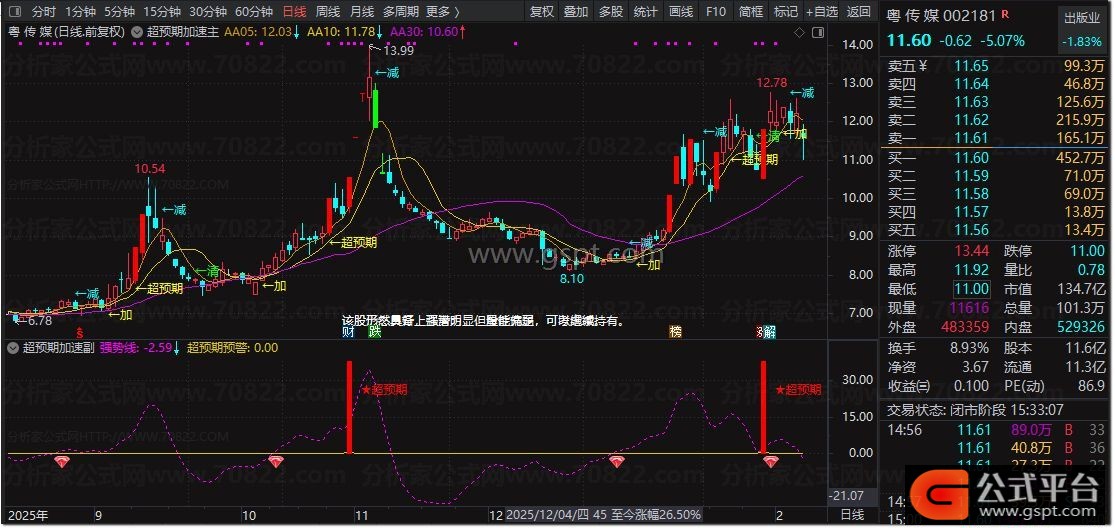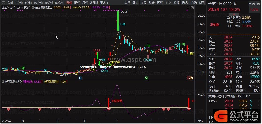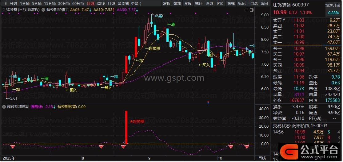 加:=FILTER(COUNT(CROSS(BB05,30),5)>=1 AND AA05>REF(AA05,1) AND 三拾日乖离率>REF(三拾日乖离率,1) AND AA10>REF(AA10,1) AND 加速度5>REF(加速度5,1) AND 速度5>REF(速度5,1) ,10) ;
