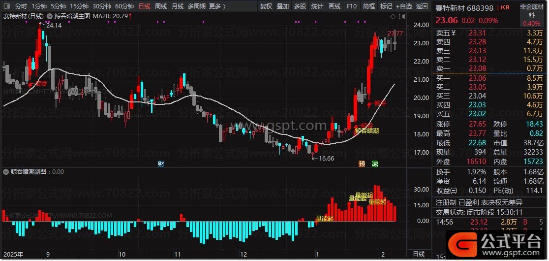DRAWTEXT(量能金叉 AND 放量阳线,LOW*0.99,'←鲸吞'),COLORRED;