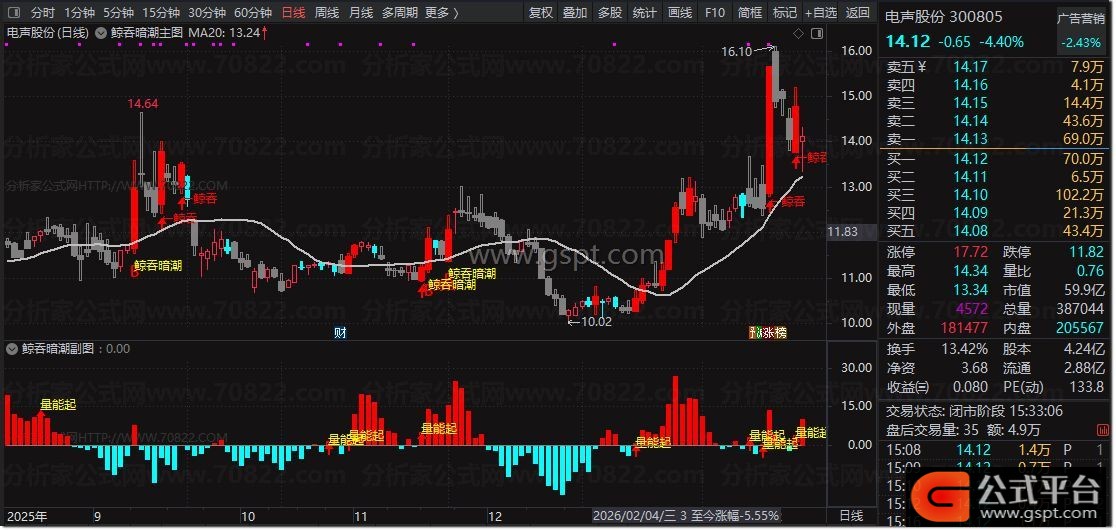 DRAWTEXT(启动信号,LOW*0.975,'鲸吞暗潮'),COLORYELLOW;