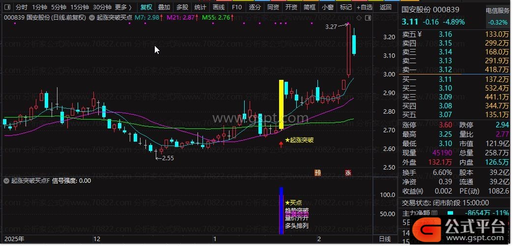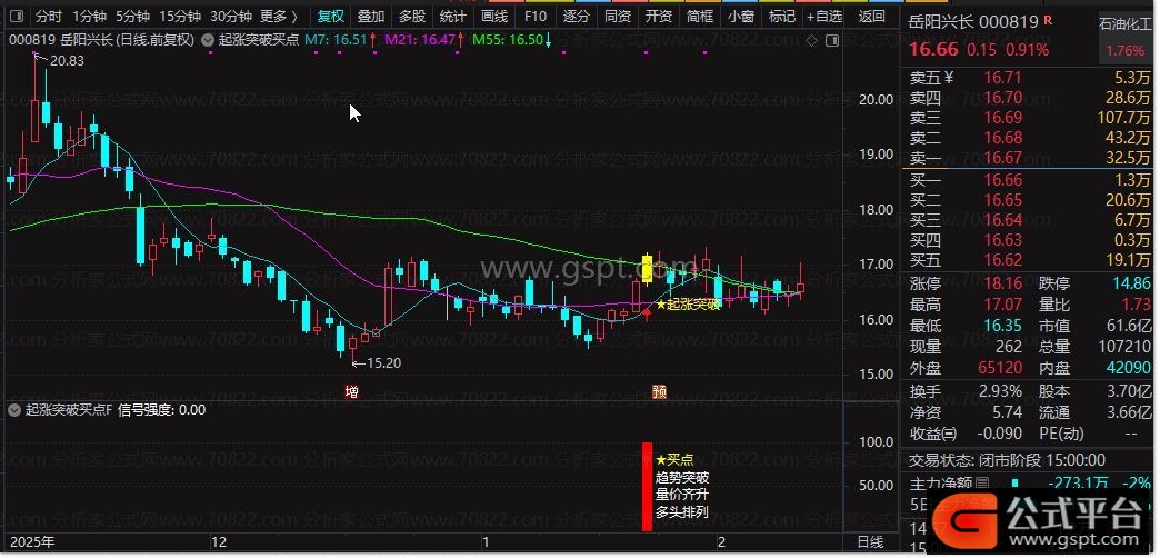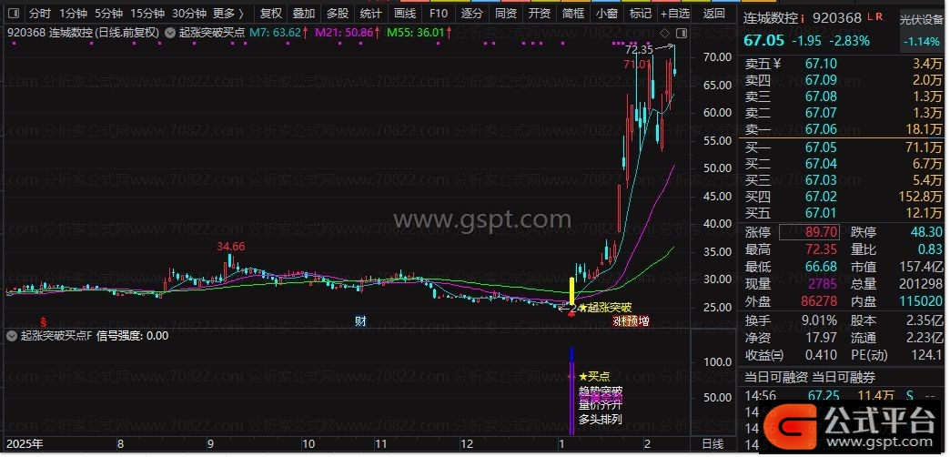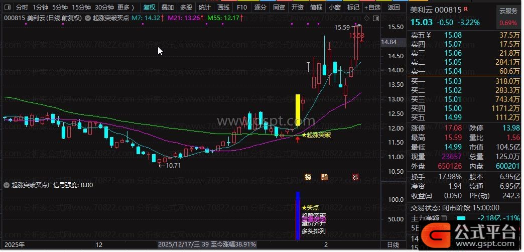 2.副图公式以红色柱体展示信号强度,标注“买点”“趋势突破”等信息,量比>2时额外标注“放量启动”;