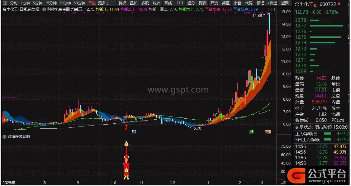 买入信号:=上穿十三 AND 上穿三十四 AND 上穿五十五 AND 涨幅条件 AND 量能突破 AND 均线向上;