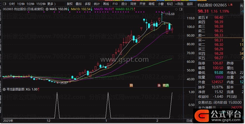 寻龙排序指标是一款集排序、副图与选股功能于一体的股票公式指标,采用右侧选股策略。无论选股结果中出现多少股票,该指标每天仅产生三个有效信号,即专注排序前三的股票。为提高选股准确性,建议在尾盘或盘后进行选股操作。该指标胜率高达95.8%,表现优异,特别适用于主板市场,并自动排除ST股、创业板及科创板等高风险股票。需要注意的是,由于手机端无法实现排序选股功能,该指标目前仅限于电脑版使用。同时,本指标不含未来函数,确保安全可靠,投资者可放心使用。