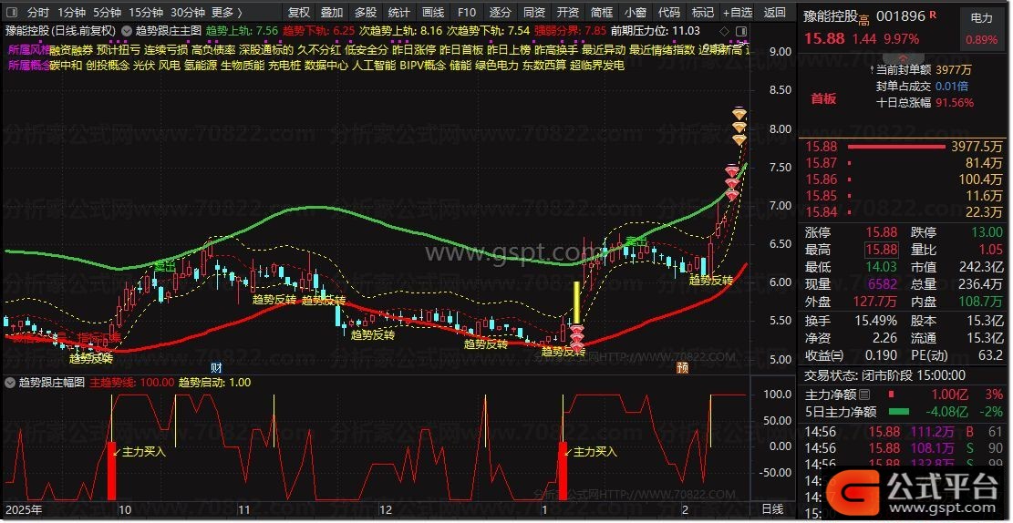 主力量价:=100*EMA(EMA(量价关系,6),6)/EMA(EMA(ABS(量价关系),6),6);