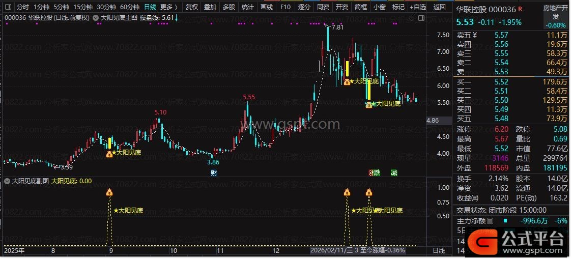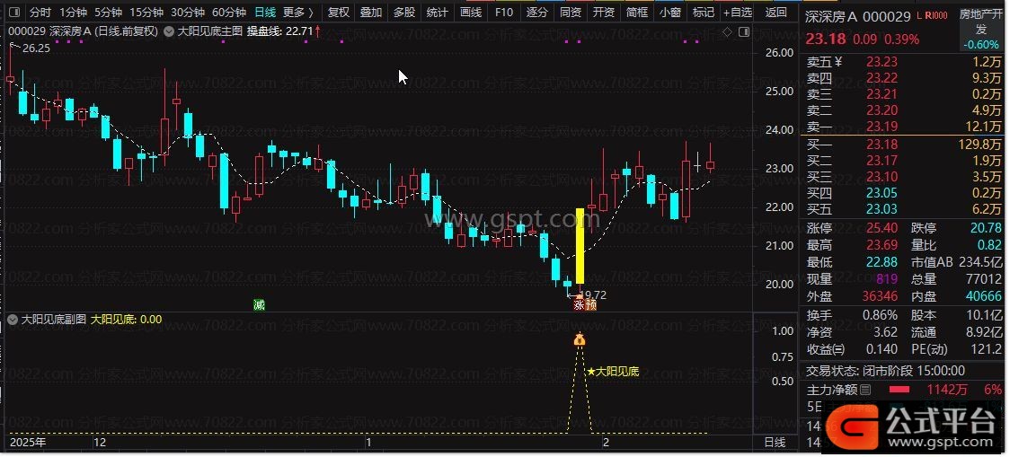 大阳见底:=gspt3>1.05 AND gspt5>0.04 AND gspt2>0.01 AND gspt7< 0.015 AND gspt8 AND gspt6< 0.025 AND REF(gspt3,1)< 1.02;