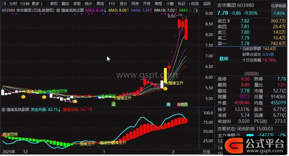 恐慌指数 := EMA((市场情绪 - 主力情绪) / (散户情绪 - 主力情绪) * 100, 8);