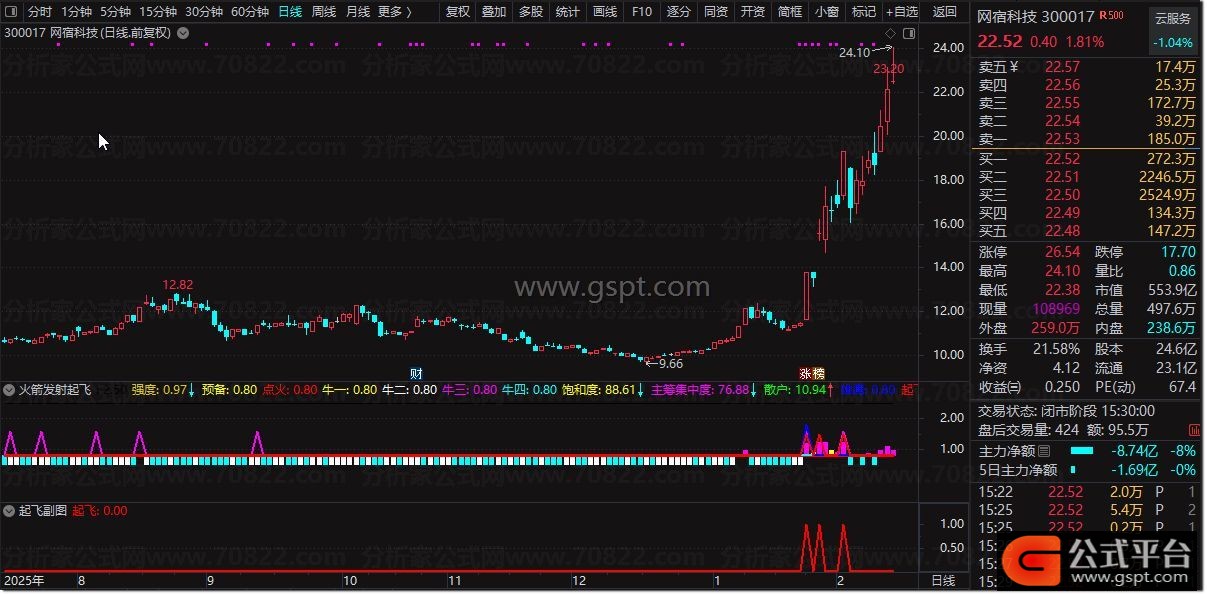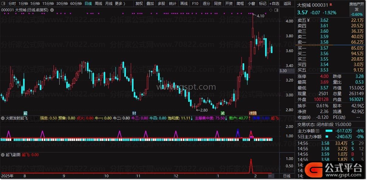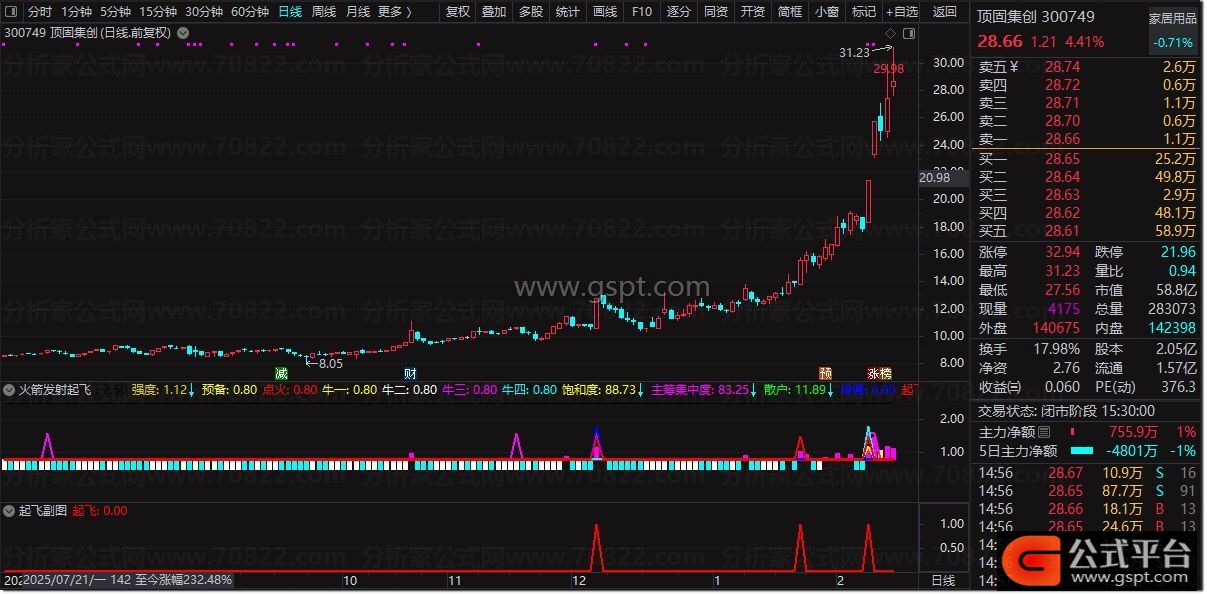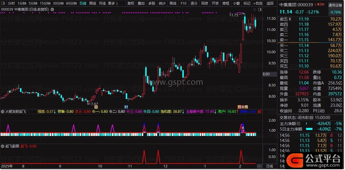 1. 信号观察:副图主要观察彩色柱状线(强度)及“预备”、“点火”、“起飞”三条水平线。当“强度”柱线为紫色且股价上涨时,表明动能充沛。