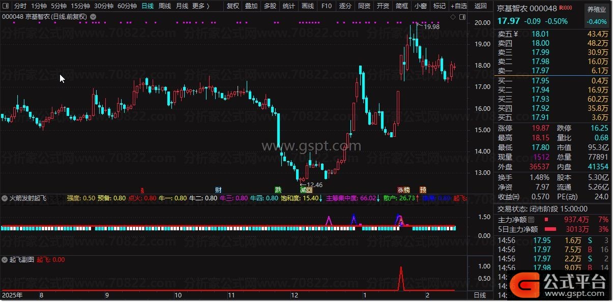 2. 核心共振:重点关注“点火”信号(红线)或“起飞”信号(粗红线)的出现,尤其是当这些信号伴随“强度”值大于0.8且股价站上关键均线时,视为较强的启动警示。