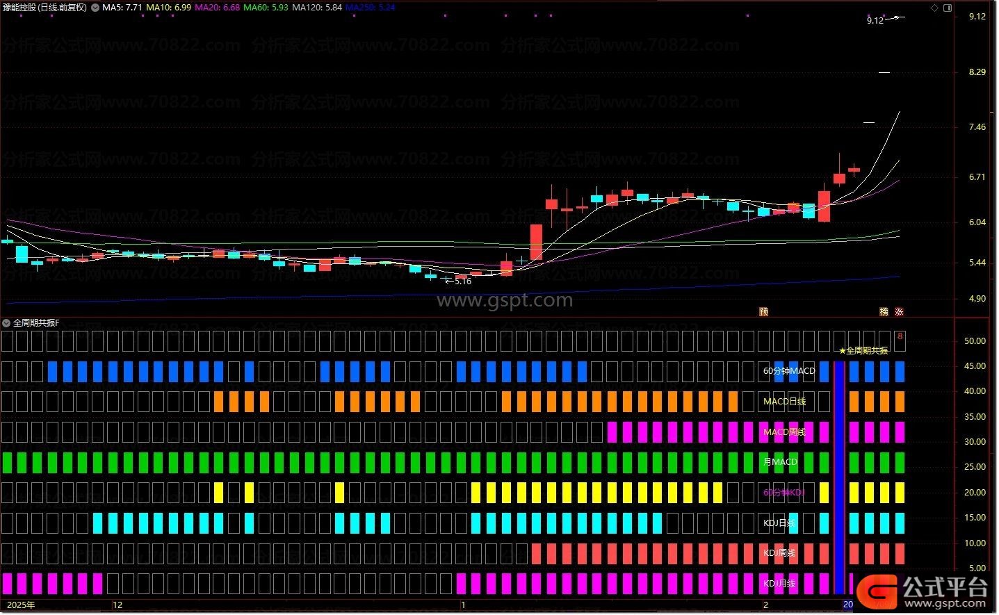 该股票公式指标核心是多周期MACD+KDJ金叉状态可视化,通过柱状图直观展示8个维度的多空状态,方便投资者快速查看股票金叉死叉情况;