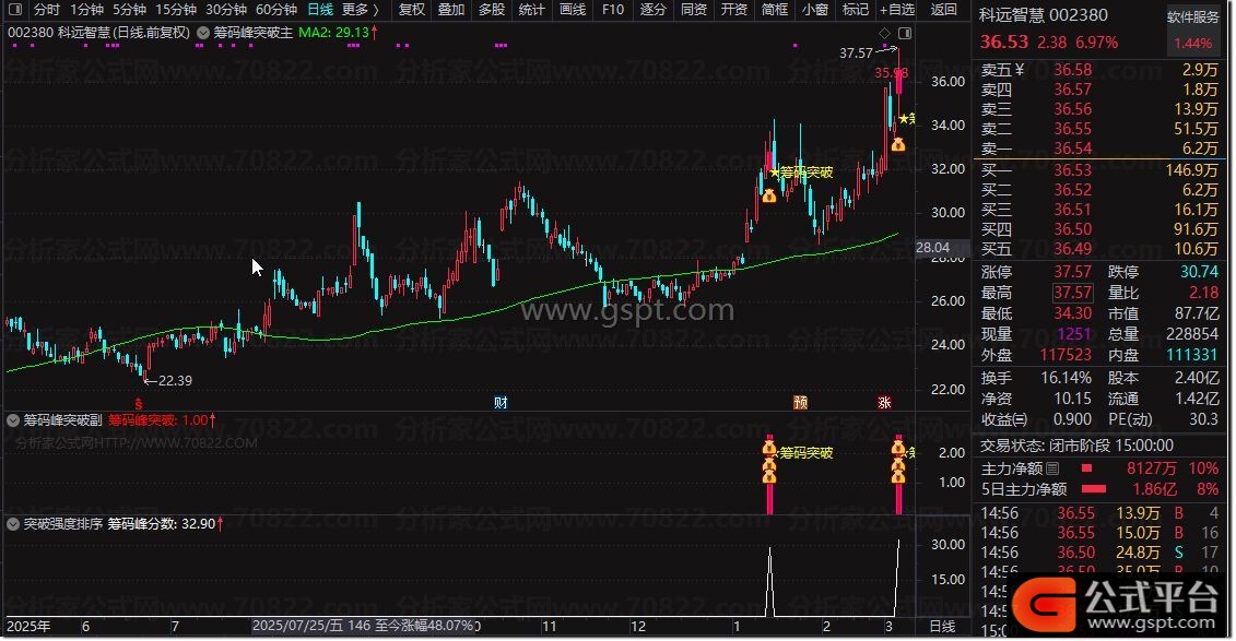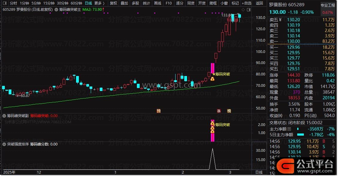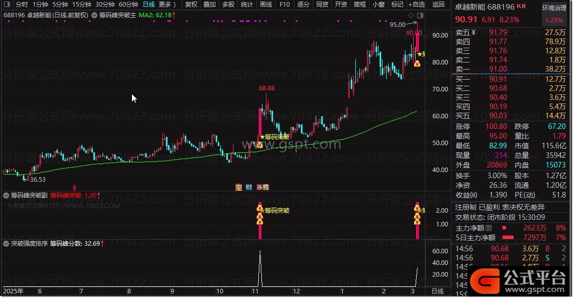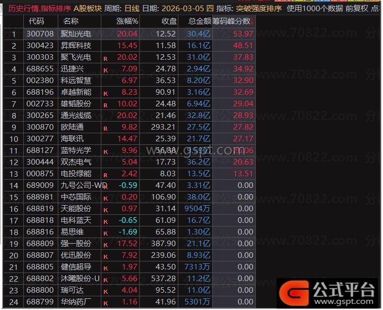 由于筹码峰突破指标调用数据量较大,选股速度相对较慢,因此改用排序功能来显示分数。排序结果既可用于副图展示,也能直接用于筛选股票。分数越高,代表筹码突破强度信号越强。