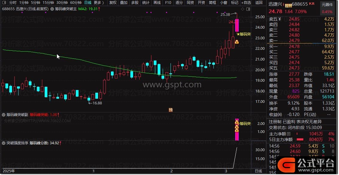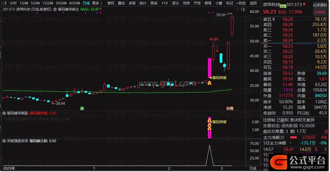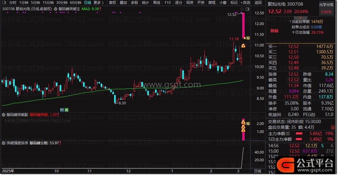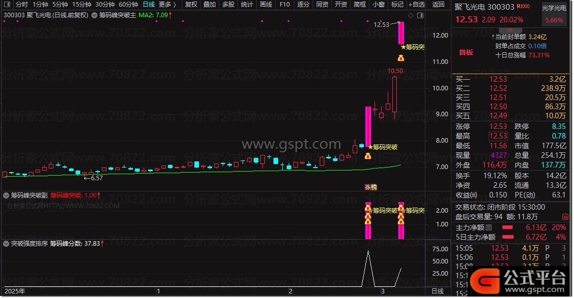 『筹码峰突破 筹码突破强度分数排序』指标套装,识别股价突破筹码密集区信号 排序筛选强突破个股