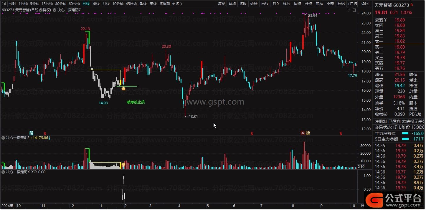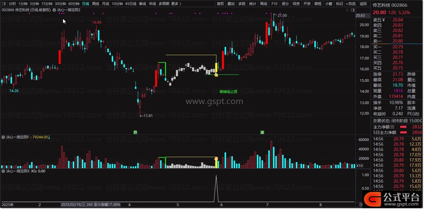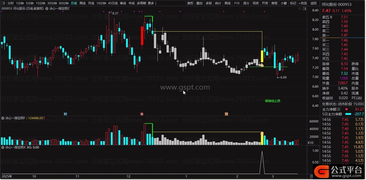 主图(Z):加载后,绿色斜线标记前期涨停启动点,黄色柱体显示蓄势区间,当出现红色图标及“破绿线止损”提示时,即为关键博弈位置。