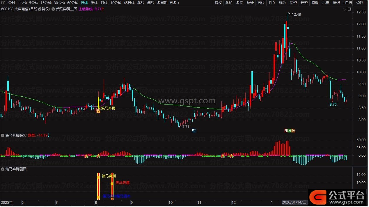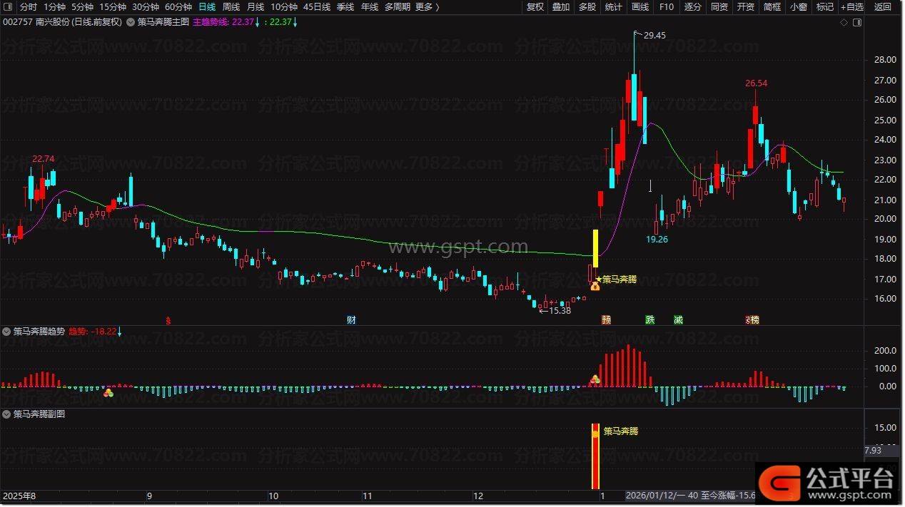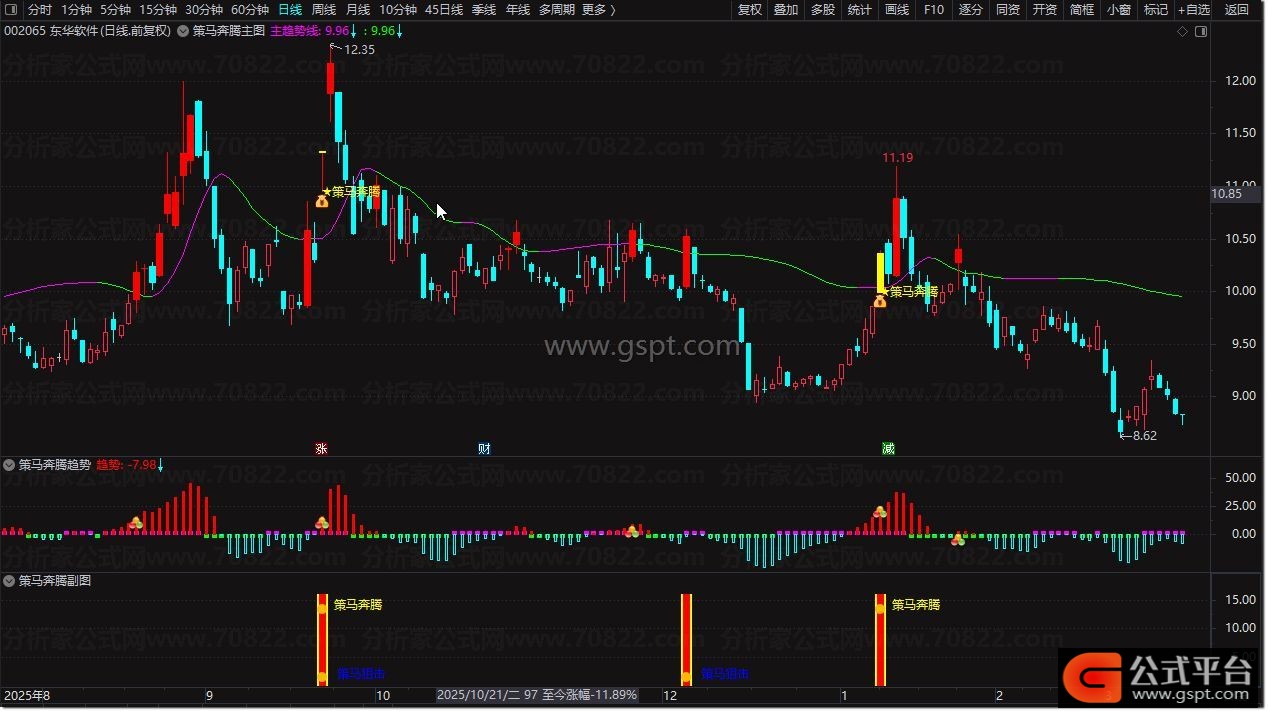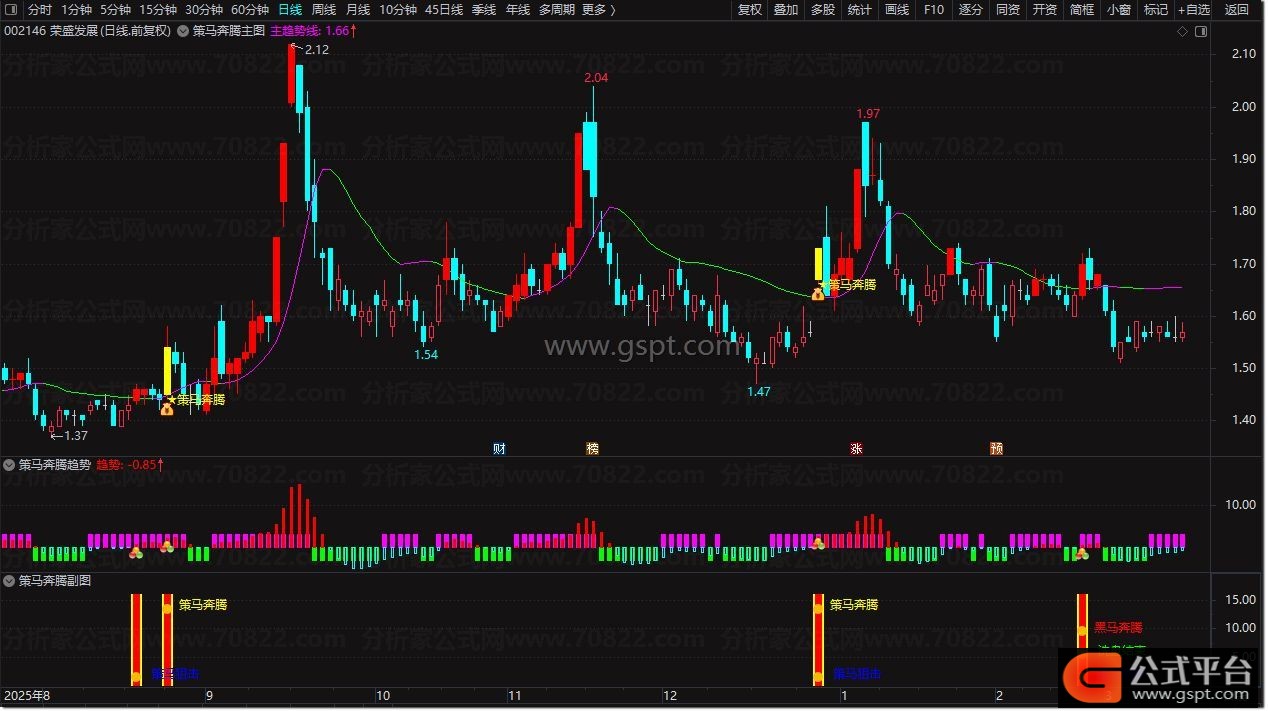 2. 副图公式 :同步成交量信号,黄色柱体为资金异动,出现信号图标确认主图买点,双重验证更稳健;