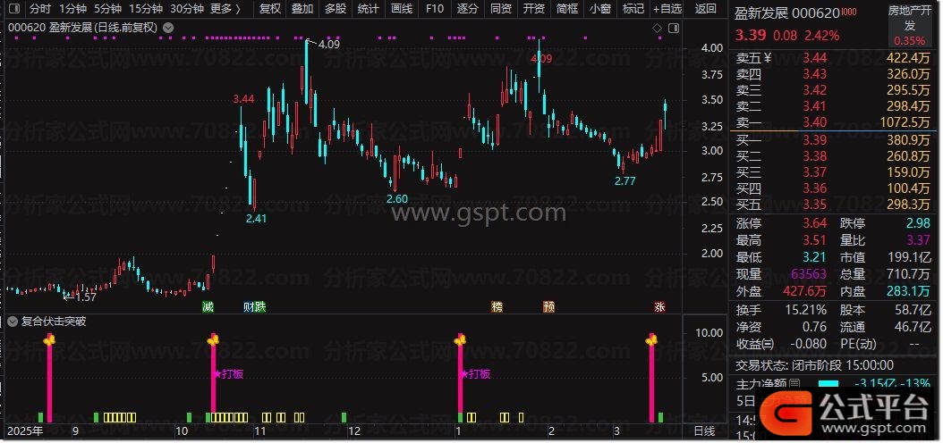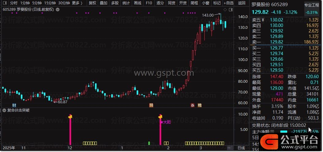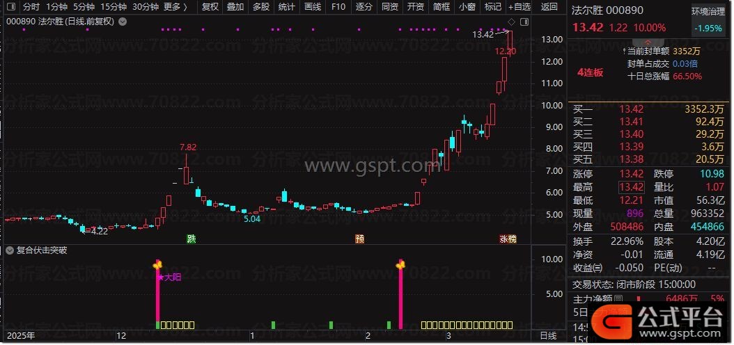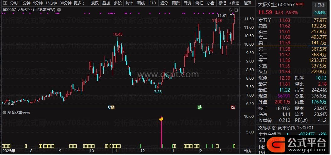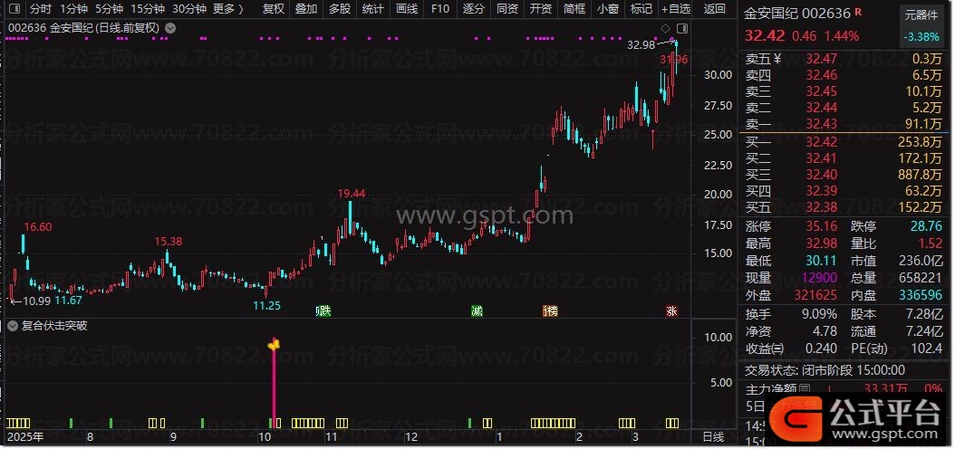 复合伏击突破是通达信专用的 副图+选股组合指标 ,融合均线乖离、量能筹码、趋势强弱三大核心算法,主打短线强势股伏击与突破信号捕捉。副图通过红柱、蓝柱监控股价乖离状态,粉色信号柱+图标标记精准伏击点,自动标注打板、大阳强势形态,黄色柱显示趋势强势区间,绿色柱提示安全入场;选股公式精简核心逻辑,一键筛选符合伏击突破条件的标的,无未来函数、信号不漂移,适配短线波段操作。