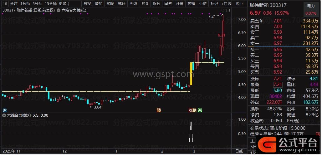 最终选股信号:当且仅当以上六个条件全部同时满足时,该指标才会发出买入提示。
