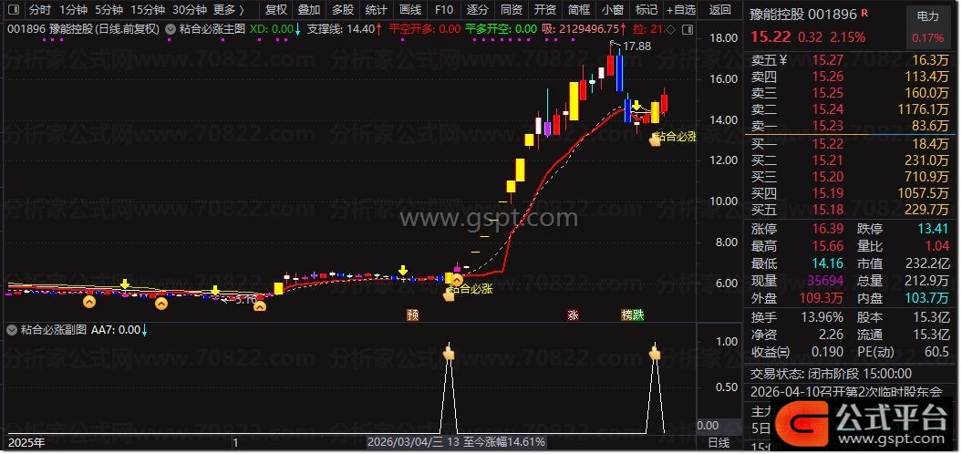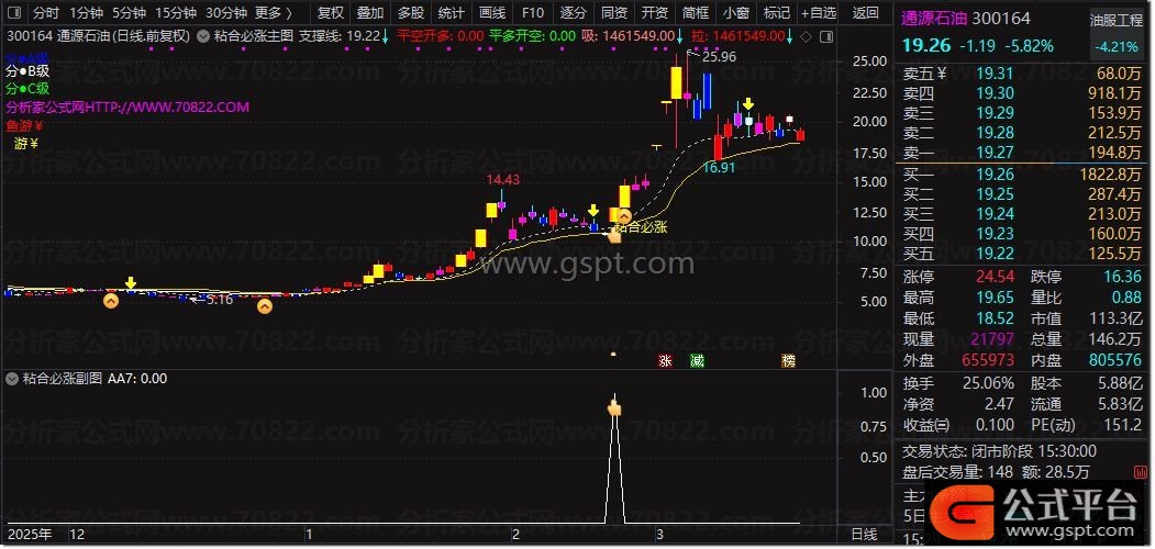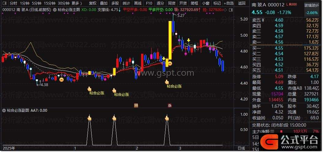 3. 打开主副图观察:若主图出现黄色“粘合必涨”文字+彩色柱体,副图同步出现黄色K线柱,且股价站稳灰色支撑线,即为共振买点。