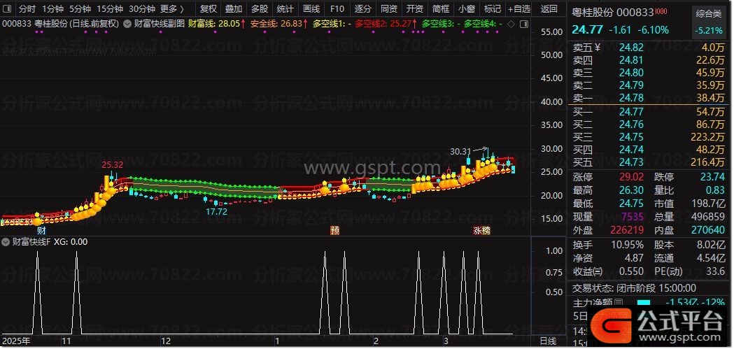 四、主图指标构成及功能:主图指标涵盖三条关键曲线,从下至上依次为财富线、安全线与多空线,形成完整的多空线指标体系。其中,多空线是多空双方的分水岭;安全线作为持股判断依据,助力投资者把握持仓时机;财富线则发挥着拉升信号的作用。
