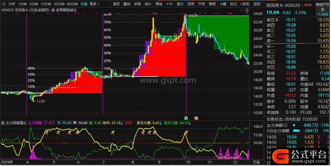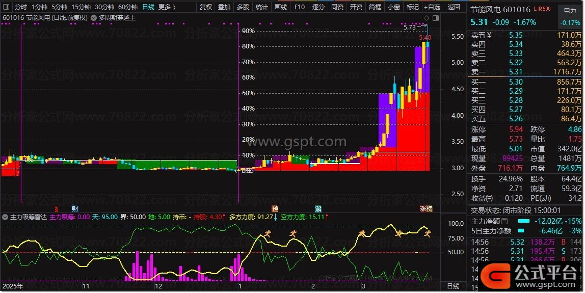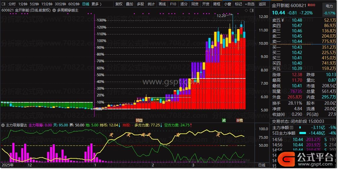 3. 紫色/粉色柱体为周线强势信号,深绿色为周线弱势信号;