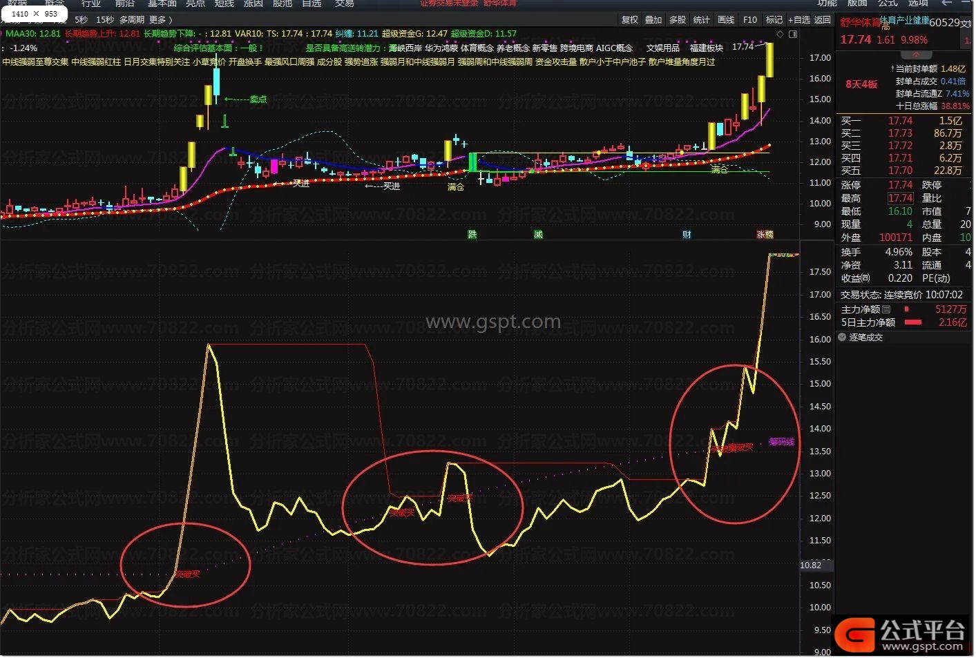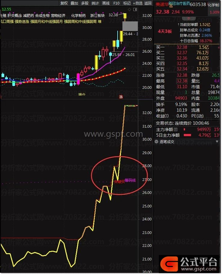 突破买点:当黄色“筹码集中度”线上穿紫色“筹码线”时,提示“突破买”,预示主力拉升启动。