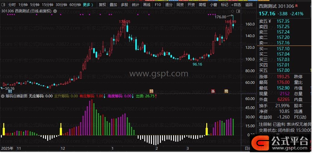 1. 副图使用:白色柱=无庄弱势,红色柱=有庄控盘,粉色柱=高度筹码控盘,绿色柱=主力出货,青黄色信号为筹码突破买入点;