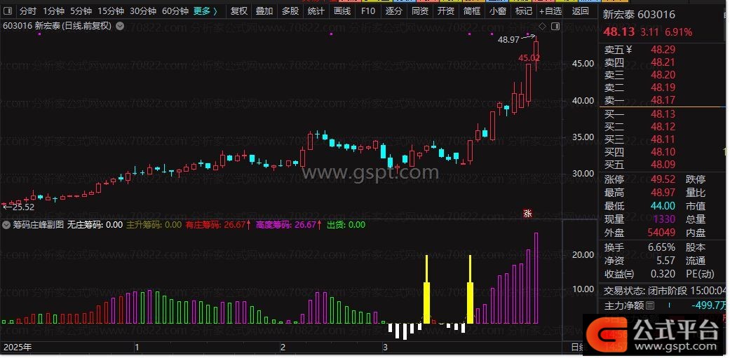 副图指标直观区分无庄筹码、有庄筹码、高度控盘筹码、出货信号,青黄色柱体标注筹码突破临界点;选股公式同步核心算法,一键筛选主力筹码启动、筹码集中的强势标的,高效锁定主升浪潜力股。