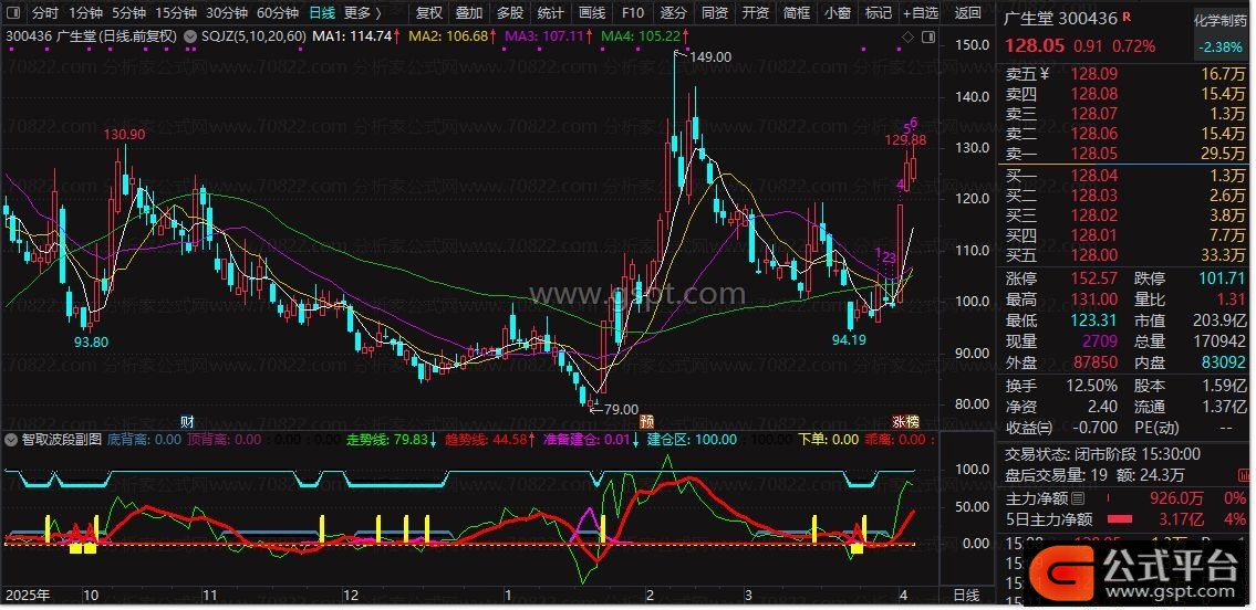 底背离:IF(gspt5< -4 ,17,0),COLORA67D3D,LINETHICK3;