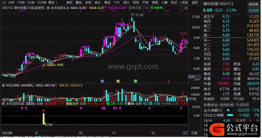 实战操作时机 :冰点龙回头信号出现当日,可在分时图企稳位置低吸,或尾盘确认信号有效后介入。操作需结合市场情绪与板块强弱控制仓位,优先选择未大涨或回调缩量个股。回调期间反复出现大阴大阳、长影线的个股,主力出货概率高,不建议参与。