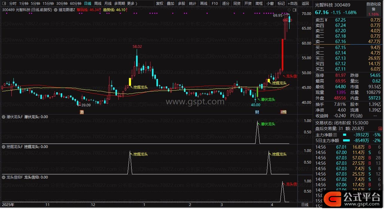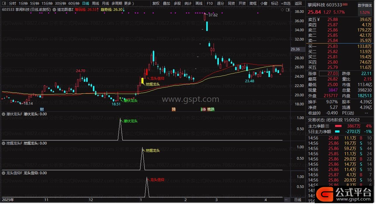 “挖掘龙头”“龙头信仰”“潜伏龙头”三级信号体系,通过价格交叉、成交量放大(换手率>5%)及均线排列,分层级提示买入时机。