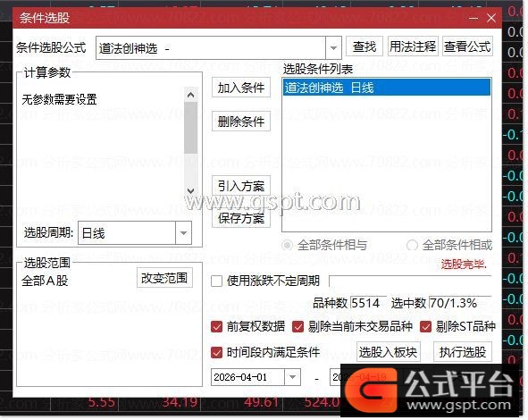 该指标组合中的【道法创神尾选】金钻指标,作为通达信平台上的明星产品,专攻创业板尾盘选股场景。其核心逻辑围绕多维度技术条件筛选展开,通过价格形态、成交量变化、均线排列、涨幅限制等综合指标,精准判断股票尾盘是否具备次日上涨潜力。