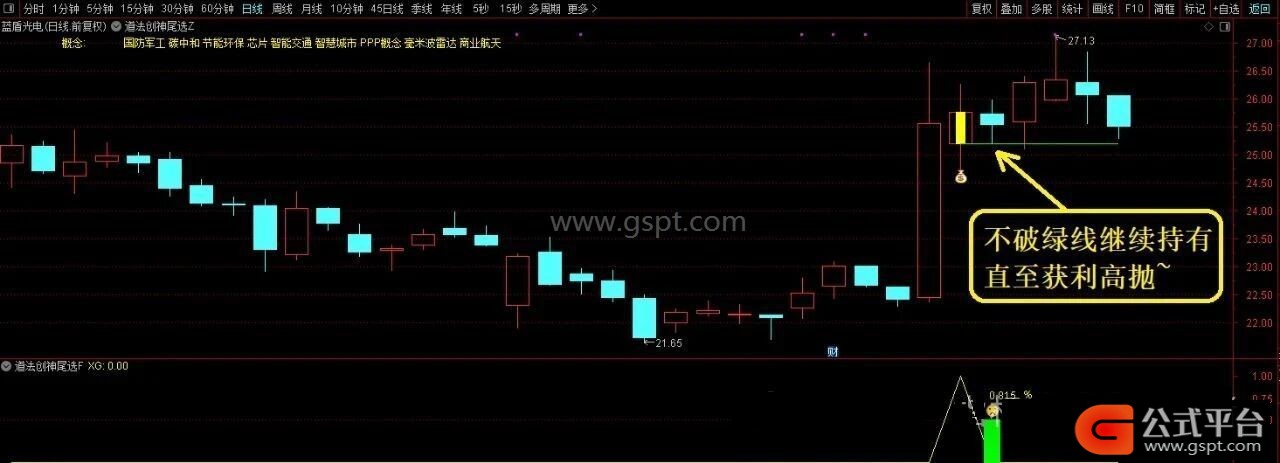 3、然后次日冲高落袋,如果低开或者当天没盈利,只要不破绿线,继续持有,直至获利高抛。