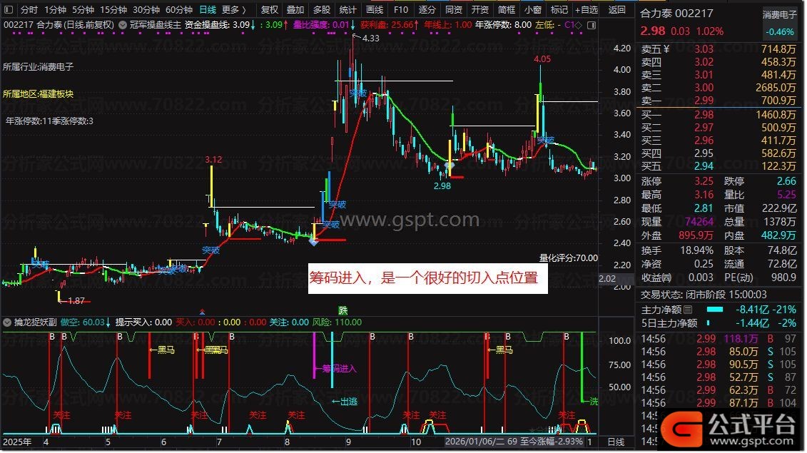 DRAWTEXT(gspt29 AND COUNT(gspt29,30)=1,70,'←筹码进入'),COLORMAGENTA;