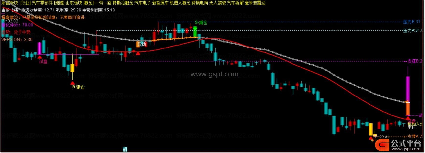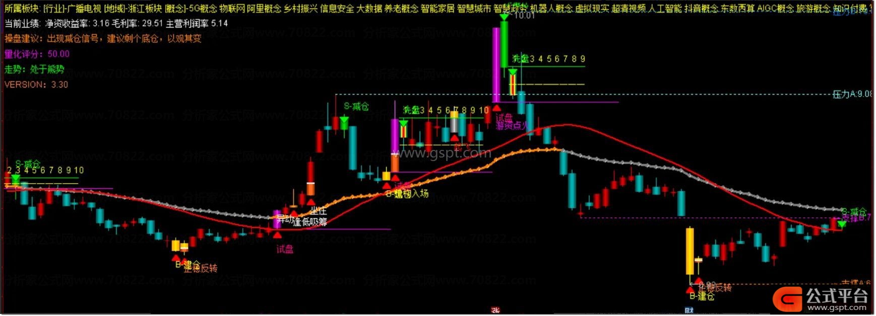 当主图出现绿色S减仓箭头,同时股价触及上方蓝色或青色压力位,代表主力开始派发筹码,行情即将调整。此时遵循信号减仓或清仓,果断止盈离场,把账面利润转化为实际收益,实现稳健投资闭环。